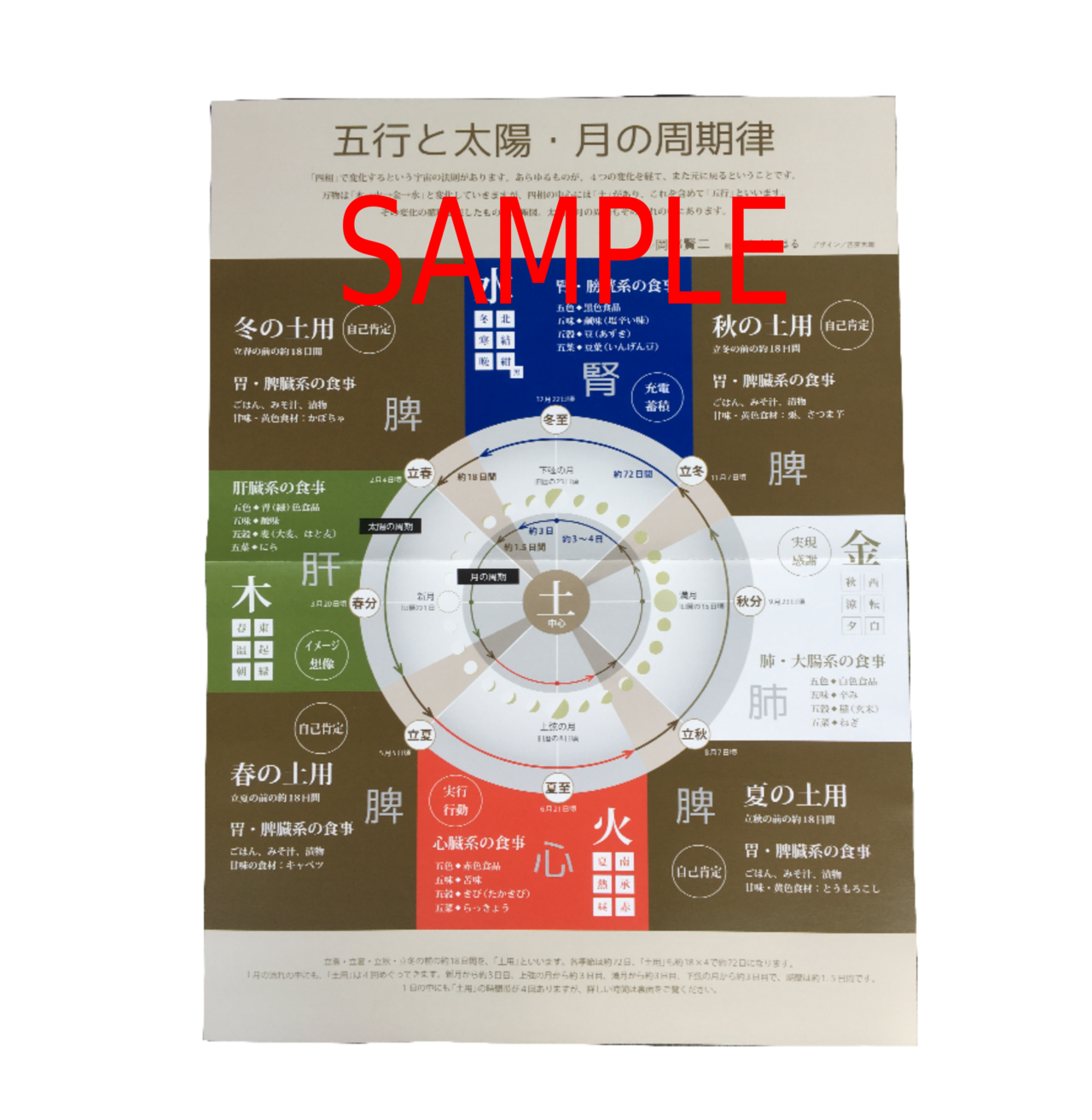 また、新月、上弦の月、満月、下弦の月は、それぞれ肝、心、肺、腎と対応していています。このシートは月のリズムと五行の関係についても、分かりやすく作られています。