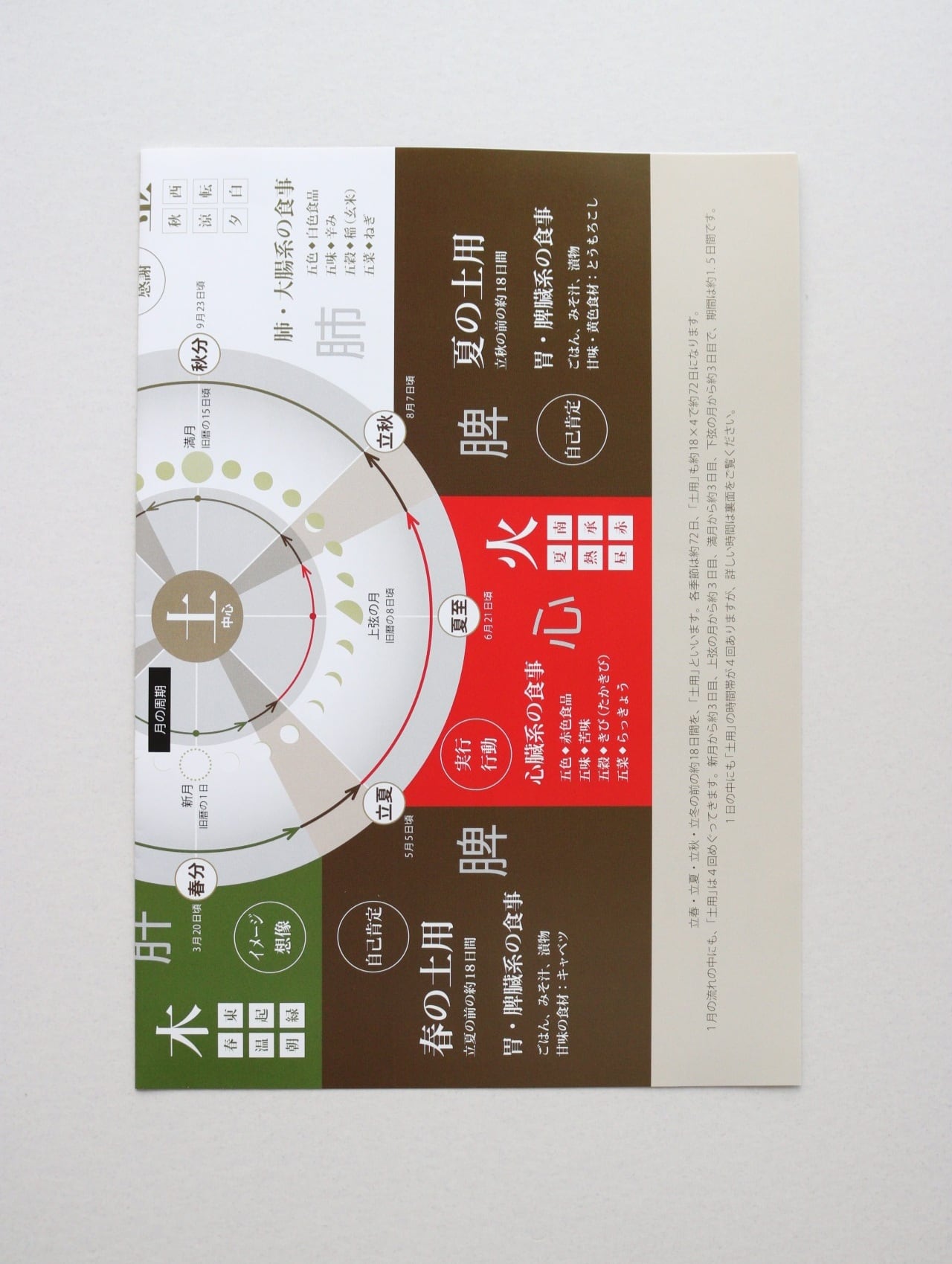 一般的な五行では、胃・脾臓系の季節は夏と秋の間の位置で表示されることが多いのですが、実際は各季節と季節の間に位置しています。本来、立春、立夏、立秋、立冬の前の約18日間が土用です。今回製作した周期律表では、これらの位置が良く分かるようになっています。